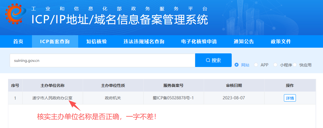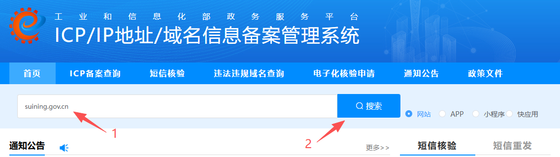 本文以suining.gov.cn(遂宁市人民政府办公室)为例,在输入框内,输入域名:suining.gov.cn,或者输入完整的单位名称:遂宁市人民政府办公室。
